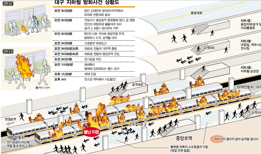 9시 53분 시작된 불은 57분 경 중앙로역에 진입한 1080호 열차에 불로 옮겨붙었고 지하역사는 순식간에 불길과 연기에 뒤덮여 탈출조차 불가능할 정도가 되었습니다. 나중에 cctv로 확인한 결과 이미 불이 난 직후인 54분께 역 안은 짙은 연기로 가득 차 한치 앞을 볼 수 없는 상태였습니다.