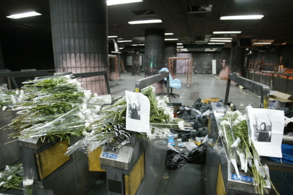 통곡의 문으로 불렸던 방화셔터가 승객들의 탈출을 막은 것은 참혹한 장면이었습니다. 평소 지하철 이용자 대다수가 입출구로 이용하는 이곳이 방화셔터로 닫힘으로서 이쪽으로 대피해온 많은 승객들이 막혀 되돌아가다 질식사했습니다. 방화셔터 앞에서 문을 손톱으로 긁다 숨진 희생자도 있었습니다. 주된 통로에 방화셔터가 설치된 것도 문제였고 희생자들이 발버둥 치는 상황에서 방화셔터를 미처 생각하지 못한 것도 참으로 안타까운 부분이었습니다.